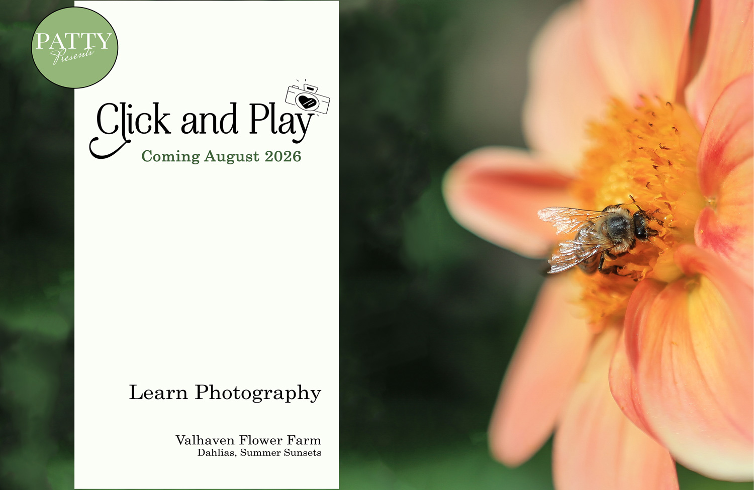 Join Patty for a fun, relaxed evening of photography among the blooms at Valhaven Farm. This Click & Play Photography Event is all about learning, exploring, and enjoying photography in a welcoming, creative environment. Stroll through flower fields in full bloom, photograph blossoms, bees, beautiful golden-hour light, and take part in playful photography challenges along the way. Light mentorship is provided throughout the event, with plenty of time to shoot and experiment at your own pace.